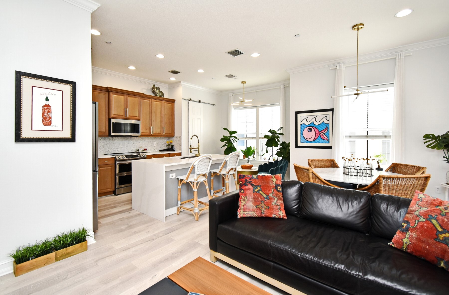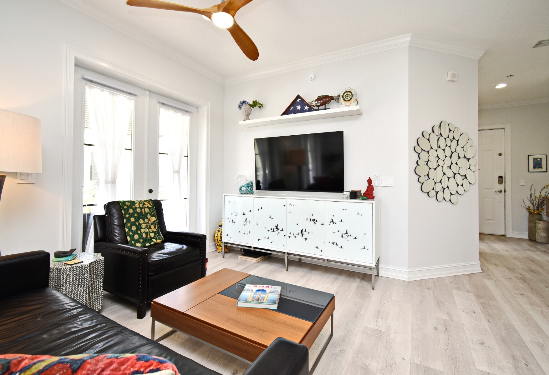 Discover the best of Celebration living in this beautifully updated top-floor corner condo built by renowned Master Builder ISSA. Perfectly situated in the heart of Downtown Celebration, you’re just steps from restaurants, shops, and year-round events. With no neighbors on any side and no stairs inside the unit, this home offers privacy and effortless living. Inside, the open floor plan is filled with natural light and flows seamlessly to a private balcony—ideal for morning coffee or evening relaxation. This spacious home features 2 bedrooms, 2 bathrooms, and a versatile den with French doors, perfect as a third bedroom, home office, or cozy reading nook. The chef-inspired kitchen has been thoughtfully remodeled with new countertops, a stylish backsplash, center island, sink, fixtures, and stainless-steel appliances. Additional upgrades include luxury vinyl flooring, beautifully updated bathrooms, new light fixtures, and modern ceiling fans throughout. Residents enjoy access to Celebration’s community pools, parks, playgrounds, and over 26 miles of nature trails—all in one of Central Florida’s most sought-after communities. With every detail refreshed and move-in ready, this top-floor corner unit offers a rare opportunity to enjoy the charm and convenience of Celebration living at its finest.